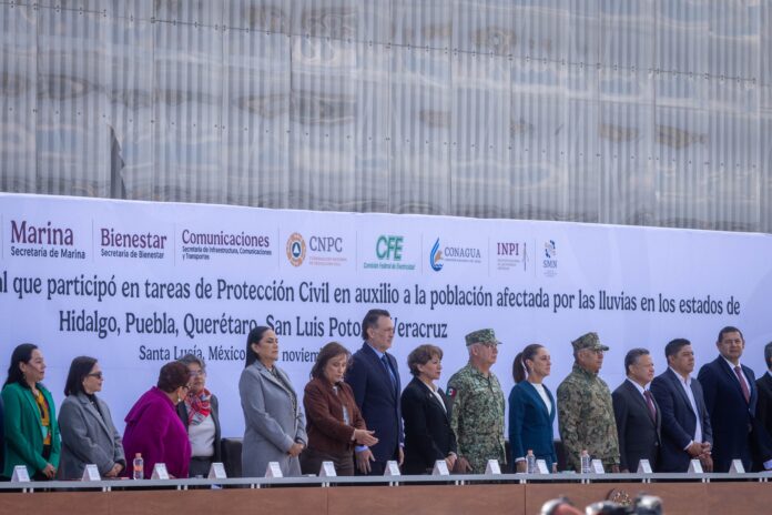 El gobernador, Mauricio Kuri González, acompañó a la presidenta de México, Claudia Sheinbaum Pardo, en la Base Aérea Santa Lucía, a la ceremonia de Reconocimiento al Personal que Participó en Tareas de Protección Civil a través de los planes DN-III-E y Marina, así como de la Comisión Federal de Electricidad (CFE), derivado de la contingencia por las lluvias en los estados de Querétaro, Veracruz, Puebla, San Luis Potosí e Hidalgo.