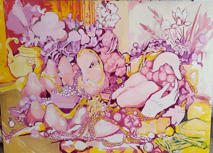 La muestra, curada por Kutratrix, estará abierta hasta el 4 de mayo próximo y expone la identidad, la vida y la muerte entre cuerpos serpenteantes, cadenas de oro y aretes de perlas; hay un deseo adentro, hecho de joyas brillantes, collares que cuelgan, pesan y caen, rubíes chorreando entre las piernas, y las piernas entre los brazos y pezones, entre cuellos erizados que se sofocan, entre besos y abrazos que lamen las manos, las manos que aprietan.