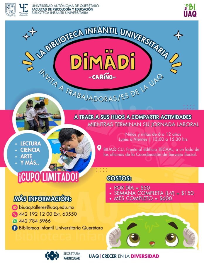 Con el objetivo de contribuir a la formación y cuidado de hijas e hijos de trabajadores de la Universidad Autónoma de Querétaro (UAQ), la Biblioteca Infantil Universitaria (BIUAQ) inició el programa “Dimädi” —que significa “cariño”, en otomí— el cual ofrece una serie de actividades para menores de seis a 12 años, mientras sus padres y madres concluyen el horario laboral.