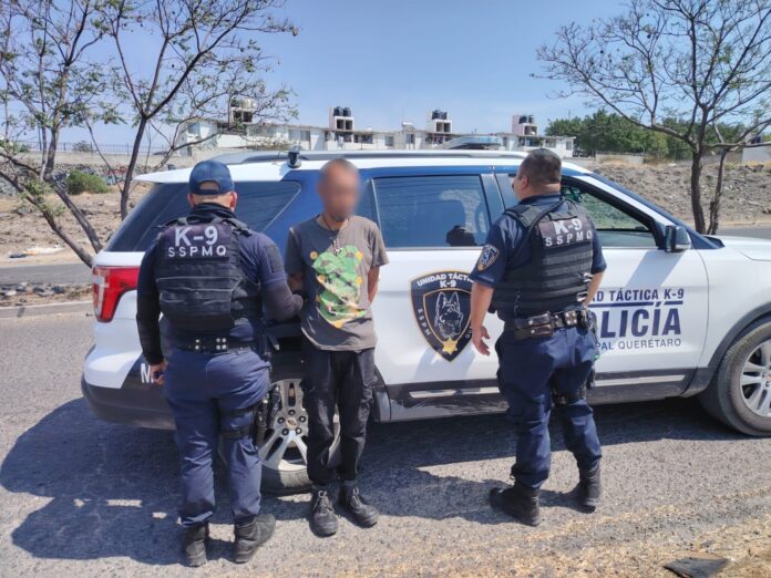 Estando en recorridos de vigilancia en la colonia Puerta Navarra, elementos policiales de la Secretaría de Seguridad Pública Municipal de Querétaro (SSPMQ) visualizaron un masculino sobre avenida Navarra que comenzó a tener comportamientos sospechosos en cuanto se percató de la presencia policial.