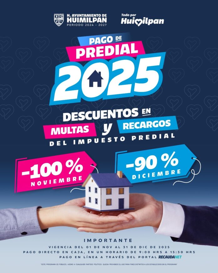 La Presidencia Municipal de Huimilpan informa a la ciudadanía que ya se encuentra disponible el programa de descuentos del Impuesto Predial 2025, con el objetivo de apoyar la economía de las familias huimilpenses y fomentar el cumplimiento oportuno de sus contribuciones.