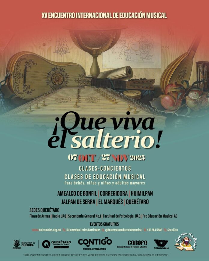 Del 7 de octubre al 27 de noviembre se llevará a cabo en Querétaro el XV Encuentro Internacional de Educación Musical ¡Qué viva el salterio!, con el objetivo de dar continuidad, promoción, divulgación, rescate, creación y vinculación de la educación musical a través del salterio y la música mexicana, patrimonio inmaterial.