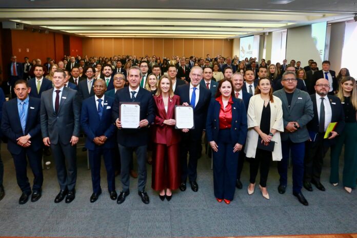 El presidente de la Asociación Mexicana de Secretarios de Desarrollo Económico (AMSDE) y titular de la Secretaría de Desarrollo Sustentable (SEDESU), Marco Antonio Del Prete Tercero, así como la presidenta de la Asociación Mexicana de Oficinas de Asuntos Internacionales de los Estados y representante del Gobierno de Querétaro en la Ciudad de México, Paloma Palacios González, encabezaron la firma de un convenio de colaboración para fomentar la internacionalización de los estados y su proyección económica en el exterior.