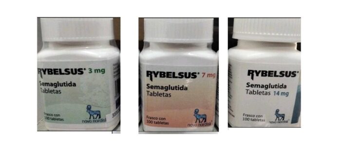 RYBELSUS (Semaglutida) tabletas de 3 mg, frasco con 100 tabletas, RYBELSUS (Semaglutida) tabletas de 7 mg, frasco con 100 tabletas, RYBELSUS (Semaglutida) tabletas de 14 mg, frasco con 100 tabletas con número de lote N087035, con fecha de caducidad DIC 26, la anomalía que presentan es que la presentación de frasco no está autorizada por COFEPRIS para su comercialización en México.