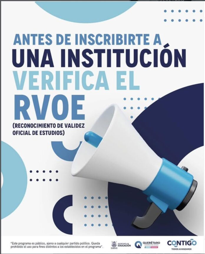 Con motivo del regreso a clases para el ciclo escolar 2026-1, la Secretaría de Educación del Estado de Querétaro (SEDEQ) hace una invitación a las madres y padres de familia, tutores y estudiantes, a verificar la legalidad de los programas educativos que ofertan las escuelas privadas de su interés, a través del listado de Instituciones con Reconocimiento de Validez Oficial de Estudios (RVOE).