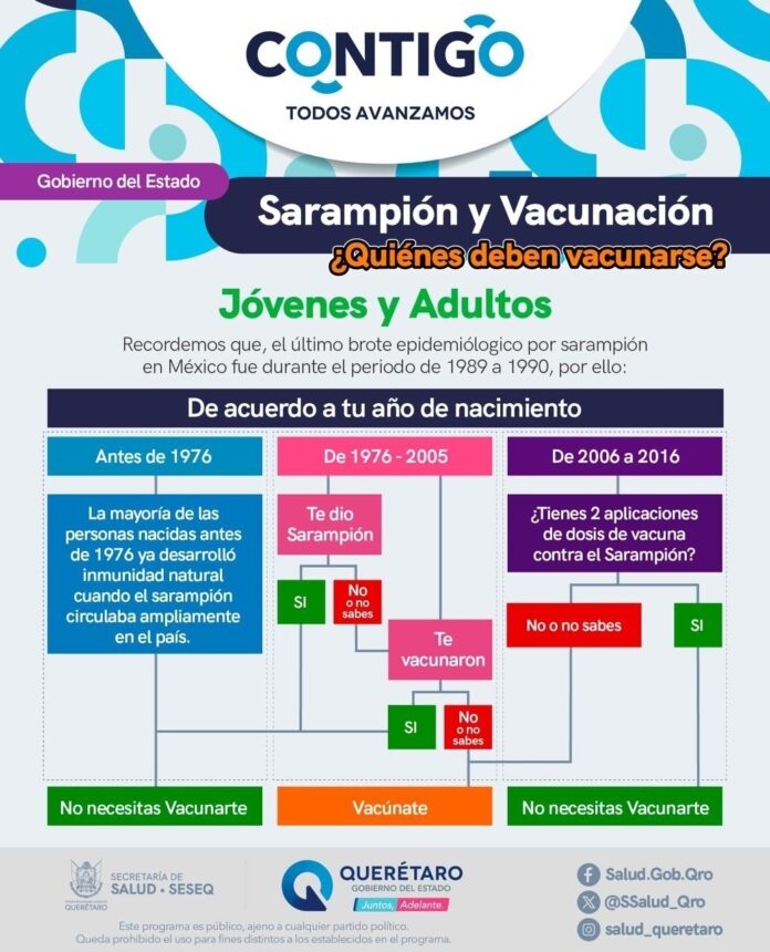 El sarampión es una enfermedad prevenible mediante la vacunación; por ello, la Secretaría de Salud exhorta de manera puntual a madres, padres y tutores a revisar la Cartilla Nacional de Salud de niñas y niños, así como a la población general menor de 49 años, a acudir de forma oportuna a los servicios de salud para iniciar o completar los esquemas de vacunación correspondientes. Las vacunas se encuentran disponibles de manera gratuita en los 198 Centros de Salud del estado de Querétaro.