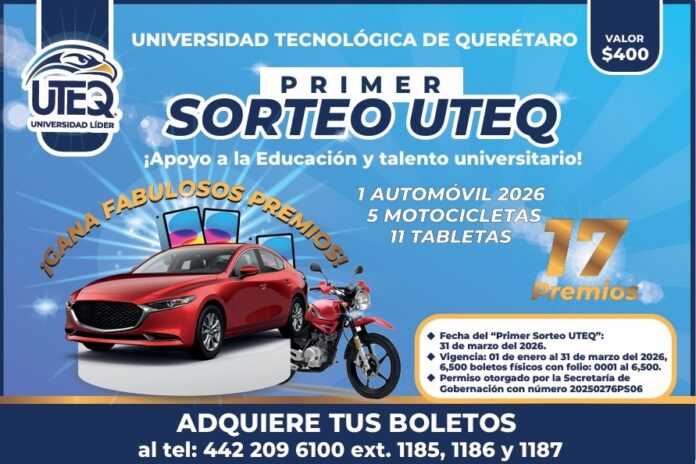 Al respecto, el rector, Luis Fernando Pantoja Amaro, explicó que este ejercicio contempla la emisión de seis mil 500 boletos, con un costo de 400 pesos cada uno, así como la entrega de diversos premios como: un automóvil Mazda 3 sedán, modelo 2026, así como cinco motocicletas Yamaha y 11 iPad Apple. El sorteo se realizará el 31 de marzo en las instalaciones de la UTEQ.