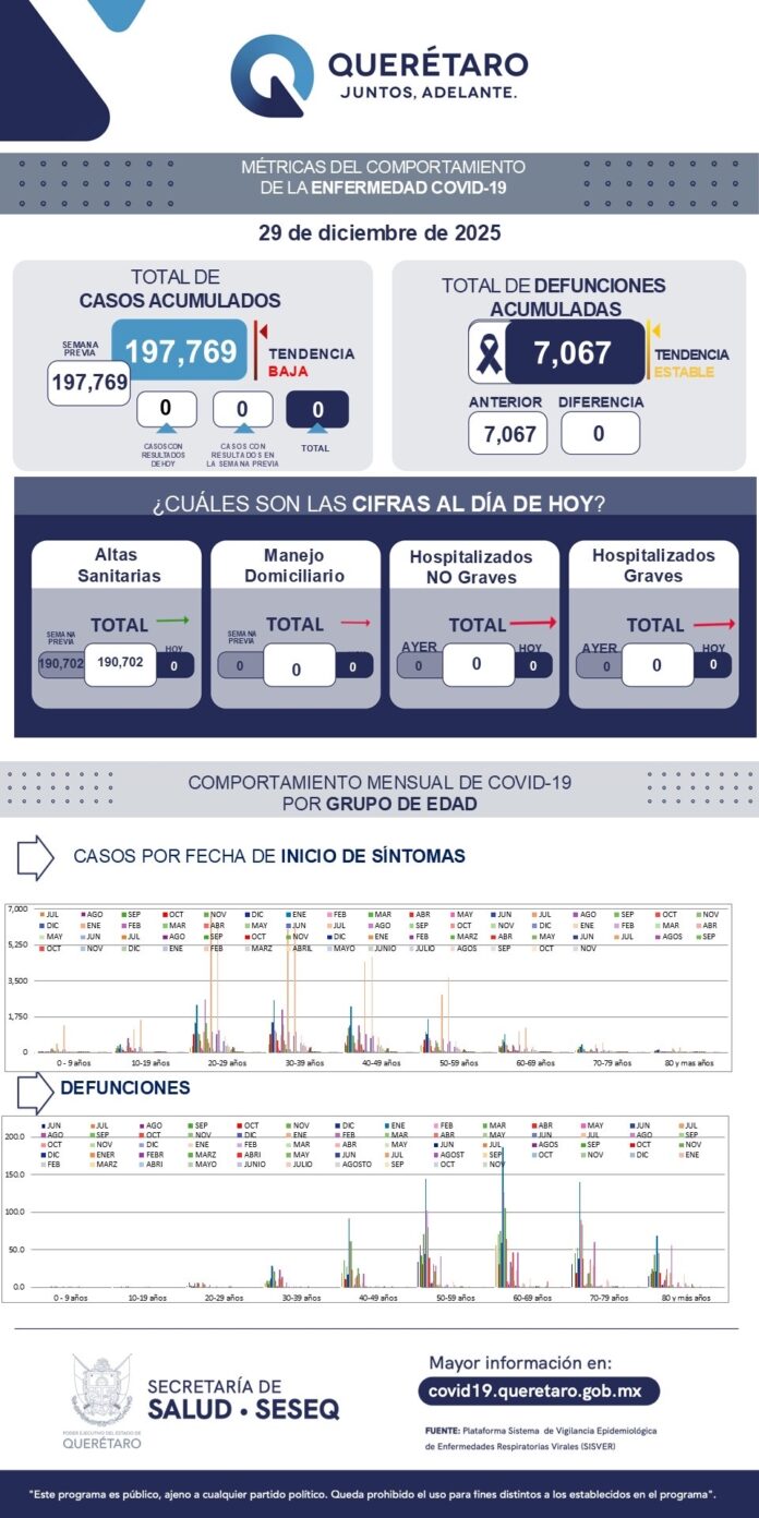 La Secretaría de Salud de Querétaro reportó este lunes cero defunciones por COVID-19, y que en los últimos siete días no se han sumado casos de la enfermedad en el estado. El registro acumulado es de 197 mil 769 casos: 54 por ciento son mujeres y 46 por ciento son hombres.