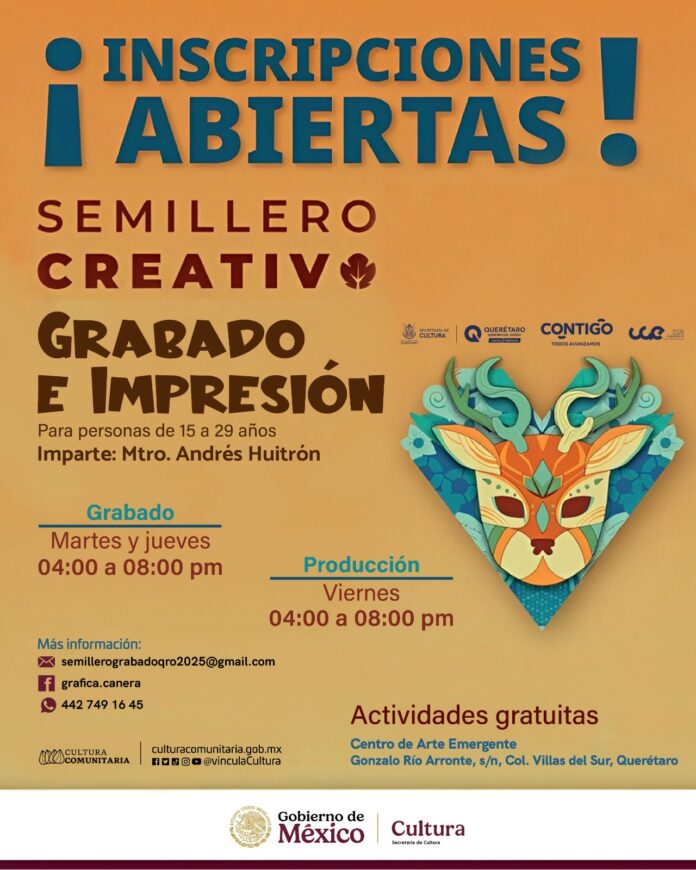 Se trata de propiciar soluciones participativas para distintos conflictos, logrando la prevención de violencias y despertando el sentido crítico de las y los asistentes en el desarrollo de proyectos artísticos para darlos a conocer en espacios públicos; las inscripciones al taller están abiertas y los detalles pueden consultarse a través del correo semillerograbadoqro2025@gmail.com , en el perfil de Facebook grafica.canera y en el número telefónico 442 749 1645.