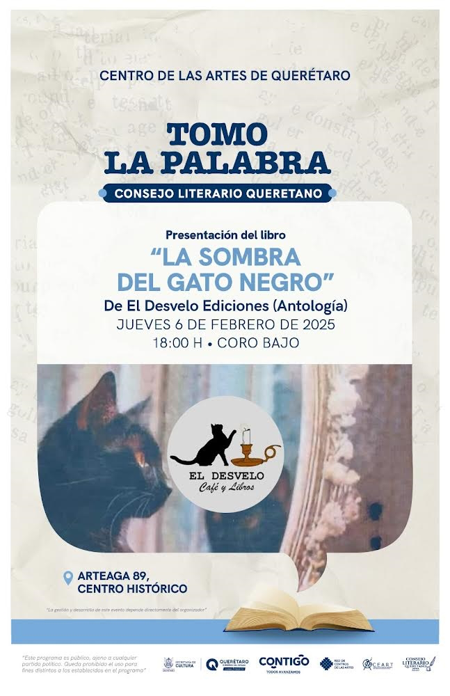 La cartelera ciudadana “Tomo la Palabra”, organizada por el Consejo Literario Queretano (CLQ) y la Secretaría de Cultura del estado (SECULT), se reanuda con la sesión de este 6 de febrero en el Centro de las Artes de Querétaro, con la presentación del libro “La sombra del gato negro”, una antología de El Desvelo Ediciones.