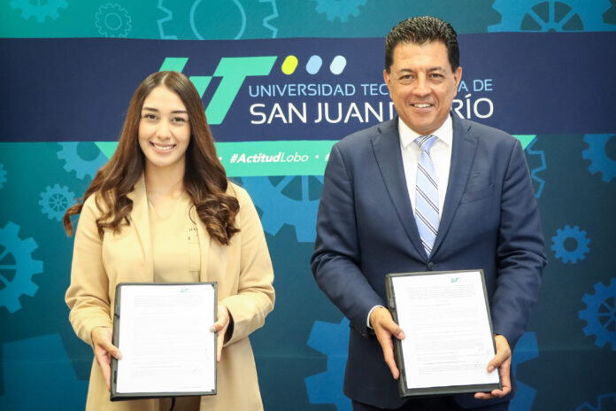 Con el objetivo de ampliar los espacios para que las alumnas y alumnos de la Universidad Tecnológica de San Juan del Río, realicen el servicio social, así como prácticas y estadías, el rector, Fernando Ferrusca Ortiz y la titular de la clínica ABME Fisioterapia, María Fernanda Aburto Mejía, firmaron un convenio con el que impulsarán el trabajo colaborativo.